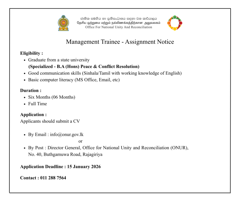 Management Trainee – Assignment Notice Eligibility :Graduate from a state university(Specialized – B.A (Hons) Peace & Conflict Resolution)Good communication skills (Sinhala/Tamil with working knowledge of English)Basic computer literacy (MS Office, […]