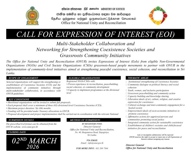 The Office for National Unity and Reconciliation (ONUR) is an entity under the Ministry of Justice and National Integration with the primary goal of promoting harmony and unity among people in Sri Lanka while celebrating diversity. We are committed to creating a society where every person respects the fundamental rights, freedom, and equality of all communities. ONUR is established, under the authority of the President of Sri Lanka, in terms of the Cabinet Decision dated 8th April 2015 in terms of the Gazette No. 1945/41 dated 18 th December 2015, affairs pertaining to national reconciliation have been entrusted with the ONUR, under the Ministry of National Integration and Reconciliation. By Gazette Extraordinary dated 9 th August 2020, ONUR was placed within the purview of the Ministry of Justice.