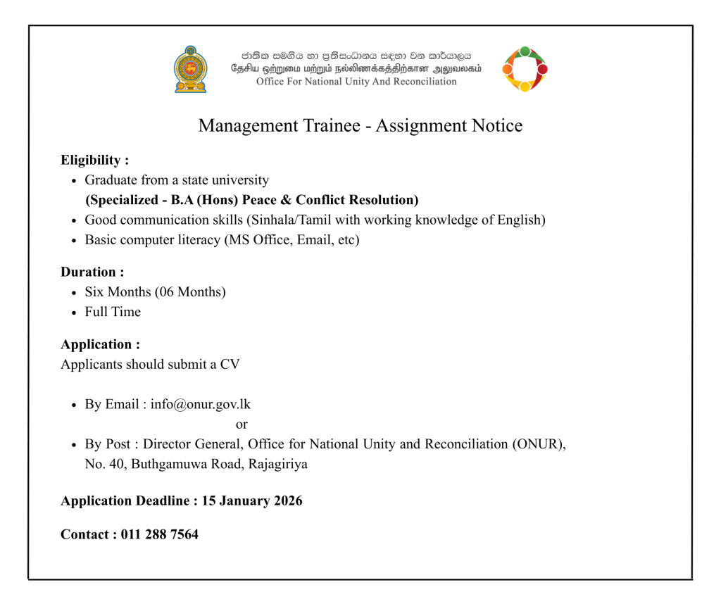 Good communication skills (Sinhala/Tamil with working knowledge of English)