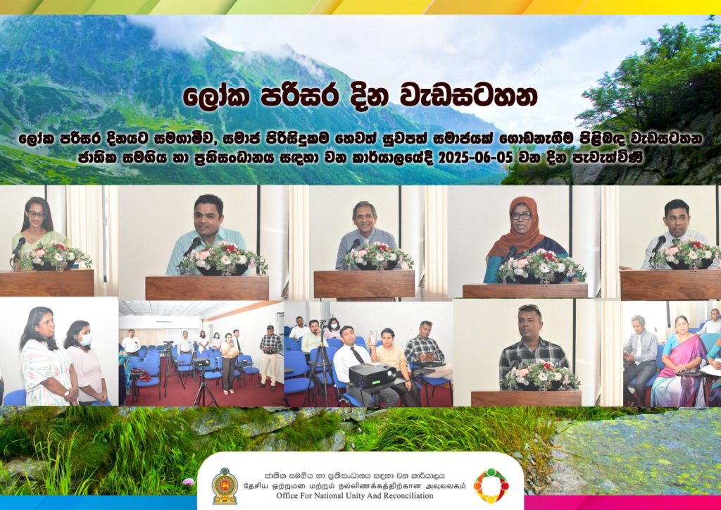 The programs organized by the Office for National Unity and Reconciliation on the occasion of World Environment Day were held on 05.06.2025. In this program, after the Assistant Director Mr. Susantha Kumara explained the objective, Professor Farina Rusaik (Board Member) made an in-depth analysis of the need for a healthy environment to build a healthy society, and photographer Mr. Dinusha Nanayakkara delivered a lecture aiming at an approach to reconciliation through the beauty of the environment. After reviewing the facts and presenting further ideas on building a healthy environment, all those present sang the environmental song. The program ended after Assistant Director H.S. Lakmal thanked the participants, including Sahajeewana Sangams, District and Regional National Integration Officers, Principals, School Teachers and Students, who were present online, and the program was moderated by Ms. Mitini Dissanayake, Secretary of the Governing Body of the Office for National Unity and Reconciliation.